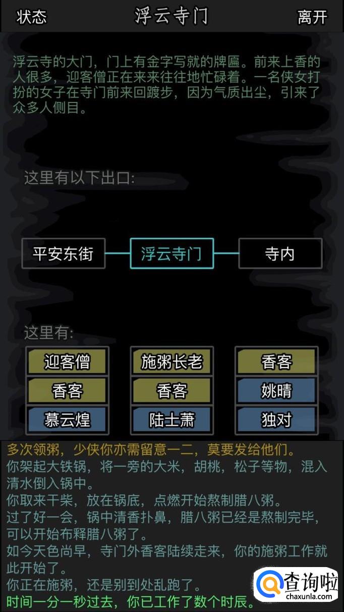 在副本里面找到施粥的寺庙,点击施粥,等待大概三分钟左右,就可以完成整个施粥任务了。