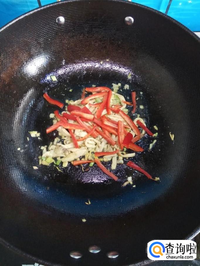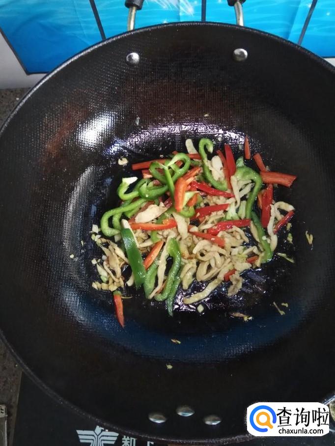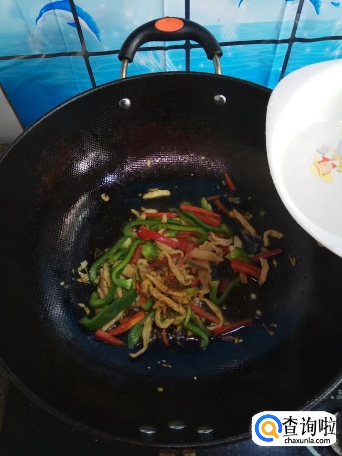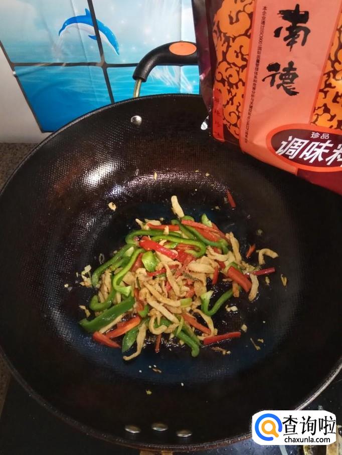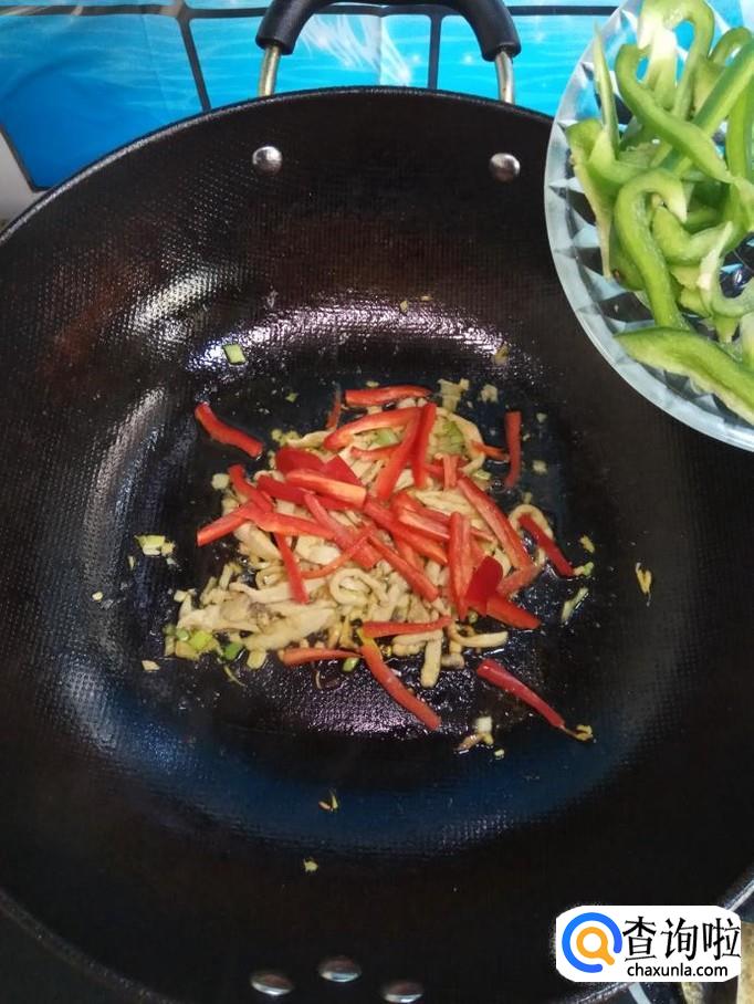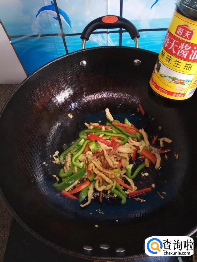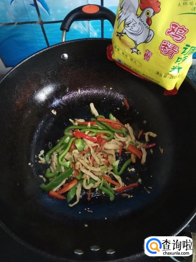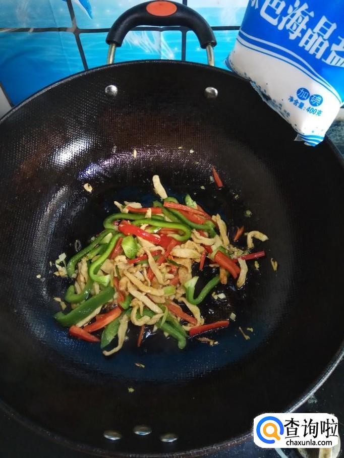 炒至青红椒微微变软之后,放入适量盐,鸡精,五香粉,搅拌均匀。