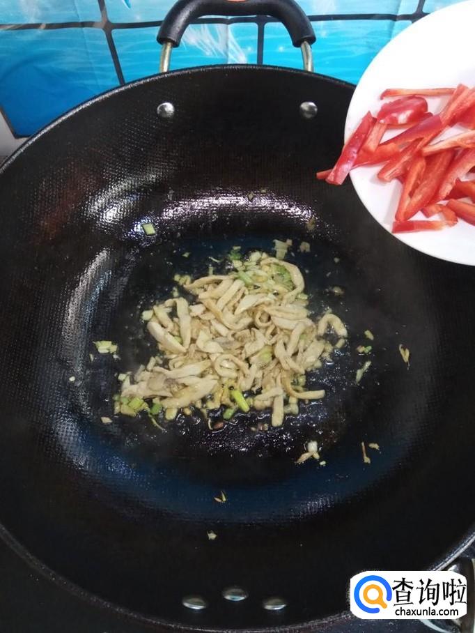 将准备好的红椒丝倒入锅中,和鸡胸肉一起翻炒均匀。