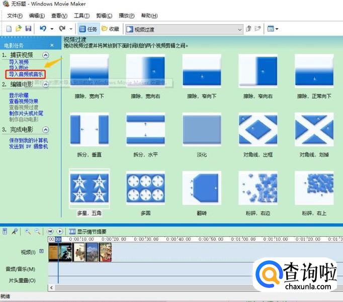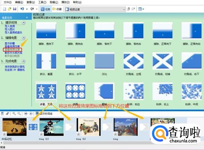 图片添加完成,我们最好给每张照片之间添加一个效果,这个时候在左侧找到"查看视频过渡"选项,然后将自己喜欢的各种效果拖动到每张照片之间的箭头处,如下图所示...