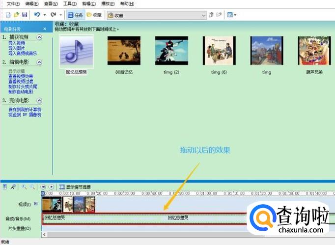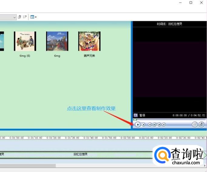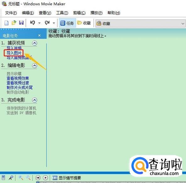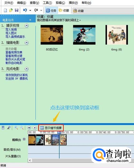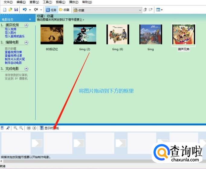添加完毕以后,我们需要将这些照片一一拖动到软件最下方的滚动窗口中,每个窗口对应一张照片,如果没有看到滚动窗口,那么点击页面左下角的"显示情节摘要"就切换过来了...