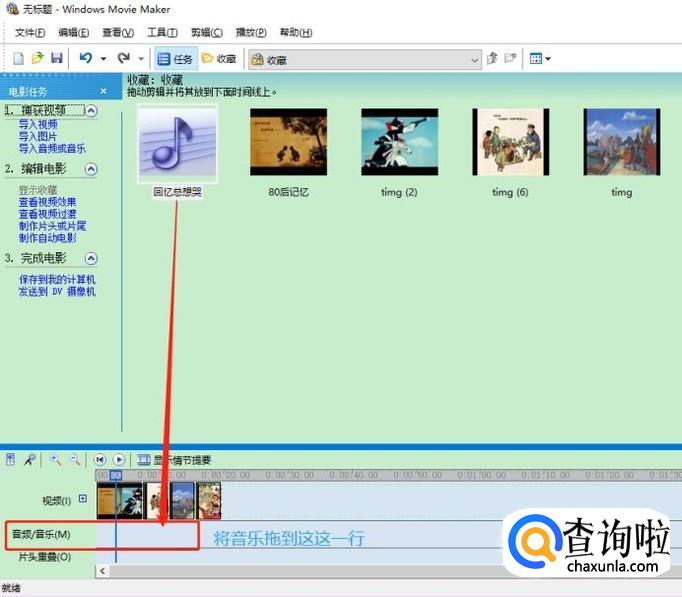 不过一般情况来说,我们都会给视频添加背景音,这时点击左上角的"导入音频或音乐",同样导入本地的音乐,然后将其拖到下方的"音频/音乐"那一行;