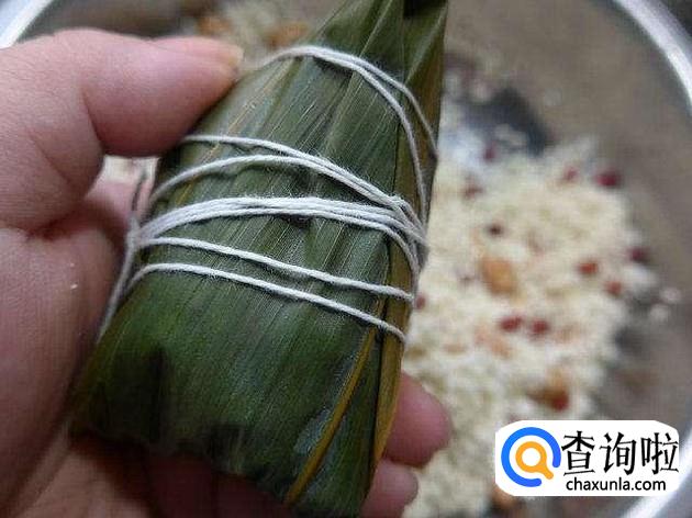 最后根据自己习惯,用粽叶把粽子包裹起来,用毛线固定好就可以了,只要保证在煮的过程中不漏出来就可以。
