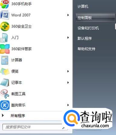 点击桌面左下角的“开始”按钮,在弹出的菜单里选择“控制面板”。
