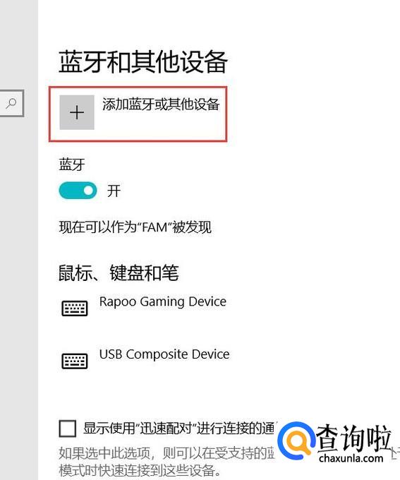 然后点击上方的“添加蓝牙或其他设备”选项。