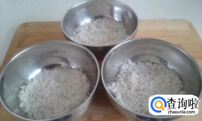 把洗好的大米适量分放在三个碗里,可以根据自己口味,给碗里加放少许盐,滴两滴香油。