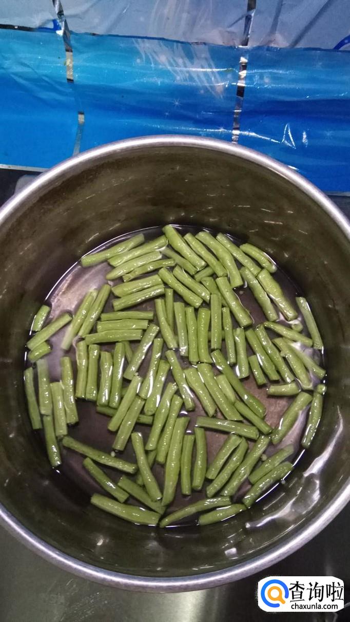 锅中烧开水,水开后将豆角放入锅中,焯至八九成熟,然后盛出放入盘中备用。