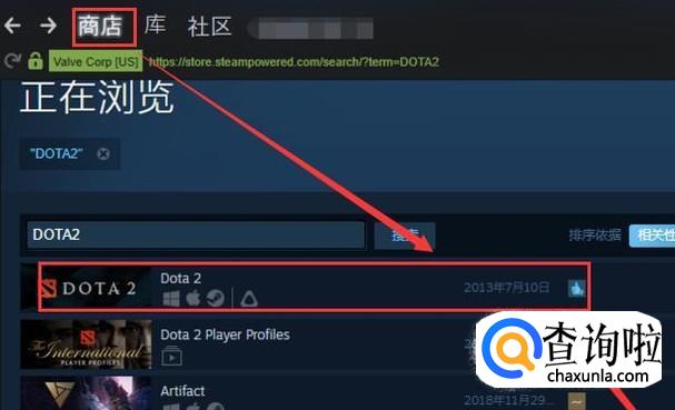 登录steam后,点击左上角商店,在搜索里输入DOTA2并搜索。