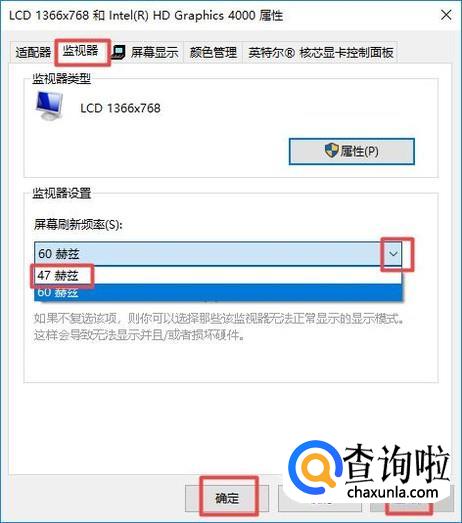 弹出的界面,我们点击监视器,然后我们点击屏幕刷新频率边上的下拉箭头,这个里面就是帧数的设置了,我们可以选择47赫兹,然后我们点击应用,之后我们点击确定,这样我们就设置好了。