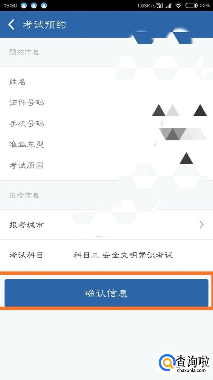 下拉找到“考试预约”,如果已经通过了科目三的考试,那么即将参加的就是科目三理论考试,即平时我们说的科目四,核对并确认信息。
