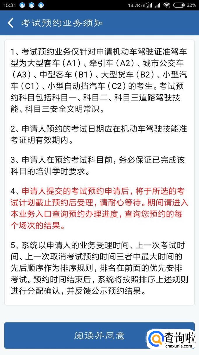 选择合适的考试地点和考试时间查询考场,同意业务声明之后就可以选择考场了,点击“预约”就会提交信息并预约考试。
