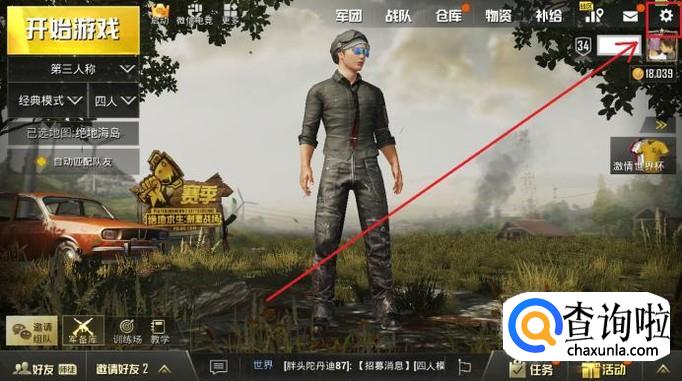 首先,我们登录刺激战场,进入到游戏大厅界面后,点击屏幕右上角的“设置”选项。