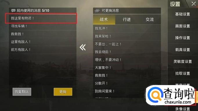 在“快捷消息”设置中,确保左侧的“局内使用的消息”栏中,含有“我这里有物资”一项。