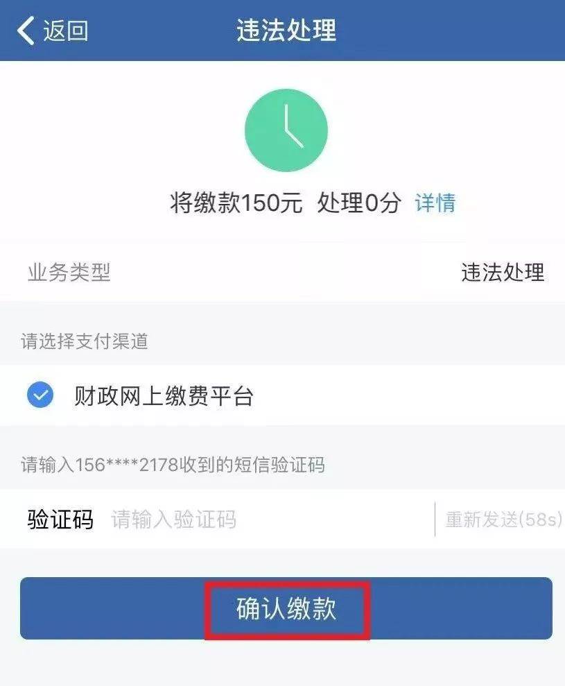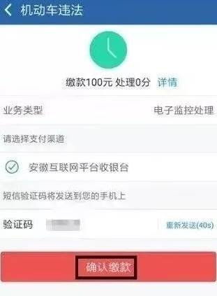6、接下来会进入违章处理的界面,这里需要输入手机的验证码,点击【确认缴款】。