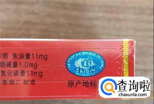 条盒及小盒旁边有一个蓝色的椭圆形原产地标志,真烟的话是可以在标志上面看到完整无缺的八颗五角星图案和中华字样。而假烟只能在一定角度看到几颗五角星并且比较模糊。