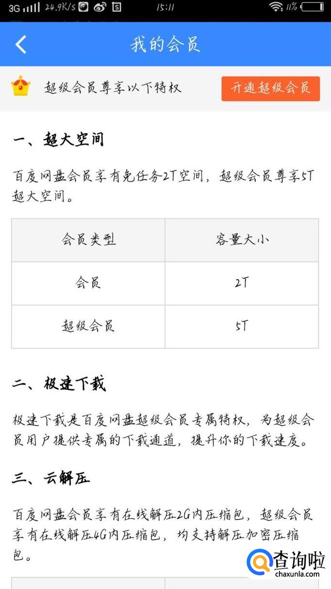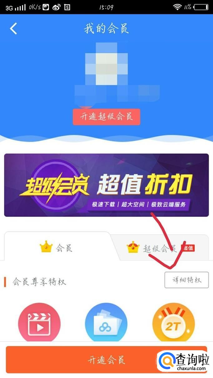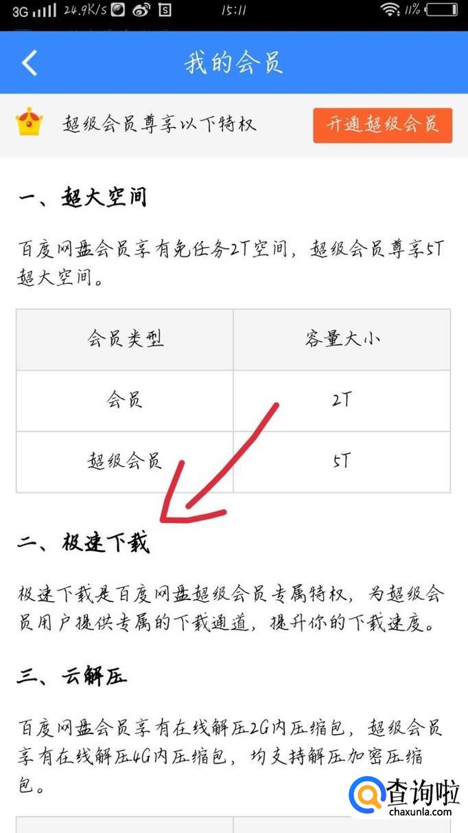 点击“详细特权”这个选项,如图1箭头所示。会出现一个新的界面,如图2所示。往下拉动手机界面,可以看到极速下载,如图3箭头所示。所以只要开通会员,就可以加速下载哦。