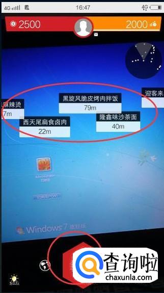 如果我们搜索附近的美食,然后它会显示出距离当前位置最近的美食,如下图所示: