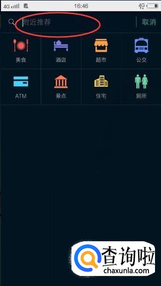 会出来一些附近推荐选项,如美食、酒店、超市、公交等等,如下图所示: