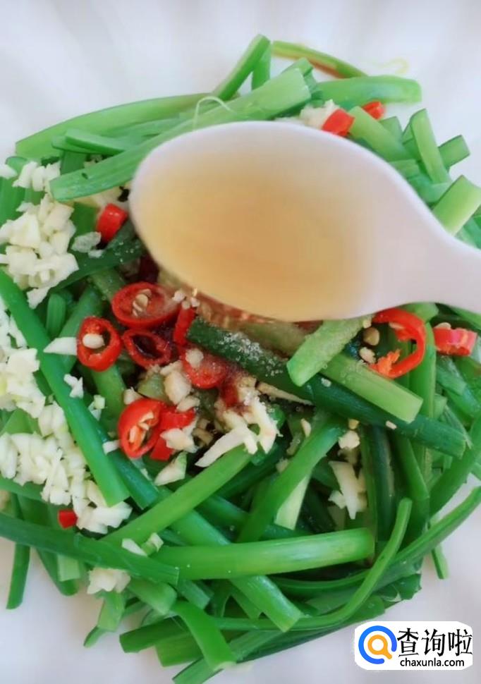 然后我们将苔菜过凉控水,用牙签划开,放入碗中,加入适量的蒜末与小米辣