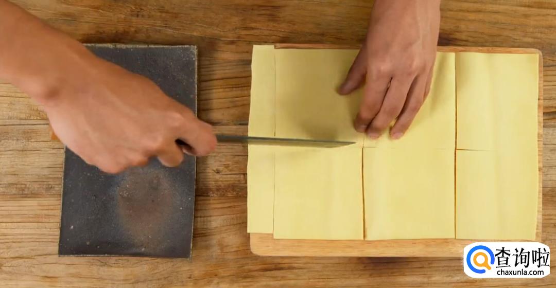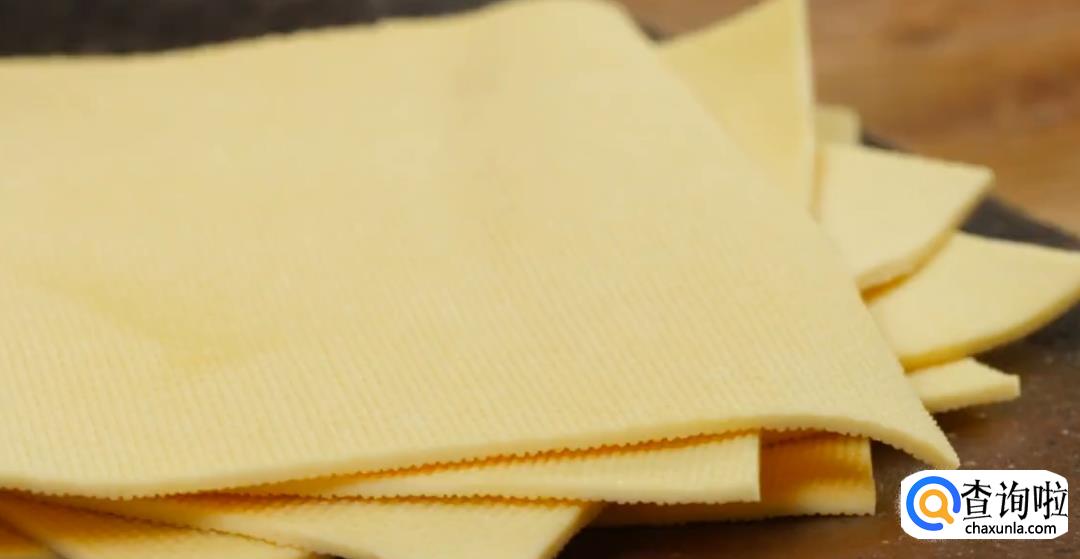 将整块的豆皮切成大张,然后进入沸水焯水,捞出后滤干。