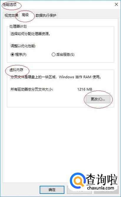弹出"性能选项"对话框,如图所示。选择"高级→虚拟内存"选项,点击右侧"更改..."按钮。