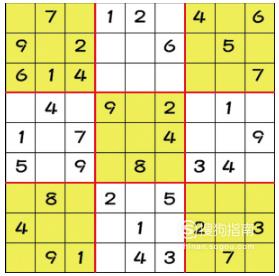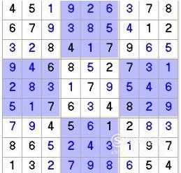 巡格法:找出在每个九宫格中出现频率较高的一些数字,再得出该数字在其余九宫格内位置,该方法一般都是应用于联除法之后。