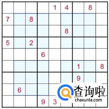 联除法:在并排的三个九宫格中的两排寻找到一些相同的数字,然后再利用九宫格得出另一排中该数字位置,该方法非常适用于中高级数独。但初期的掌握上会比较困难。