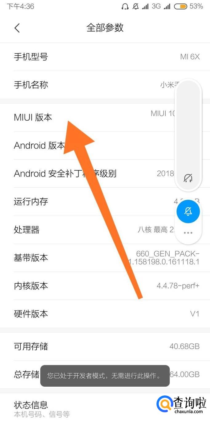 接着连续点击“MIUI版本”,直到手机屏幕提示手机已经进入开发者模式。