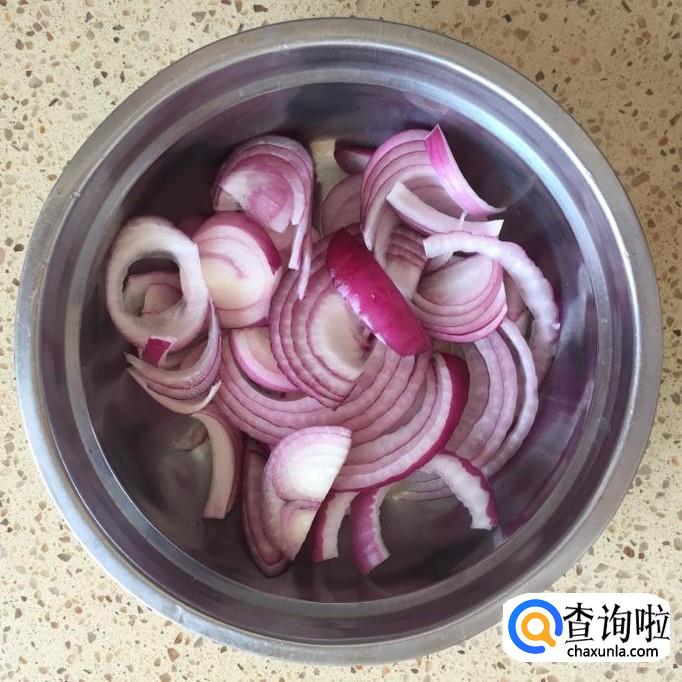 取一个小洋葱,将洋葱切掉头部、尾部,外膜去掉,洗一下,再切成丝状;