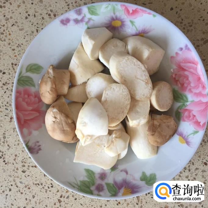 取三四根杏鲍菇,将杏鲍菇洗净,滚到切成块状;这样切,煮起来比较不容易熟,但是吃起来比较有嚼劲;