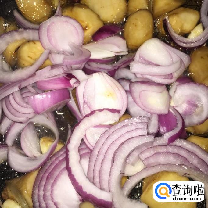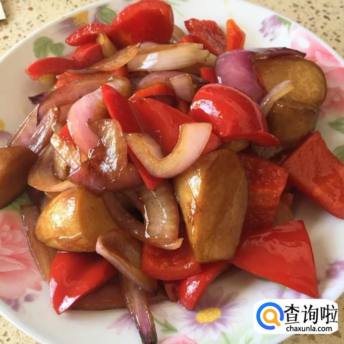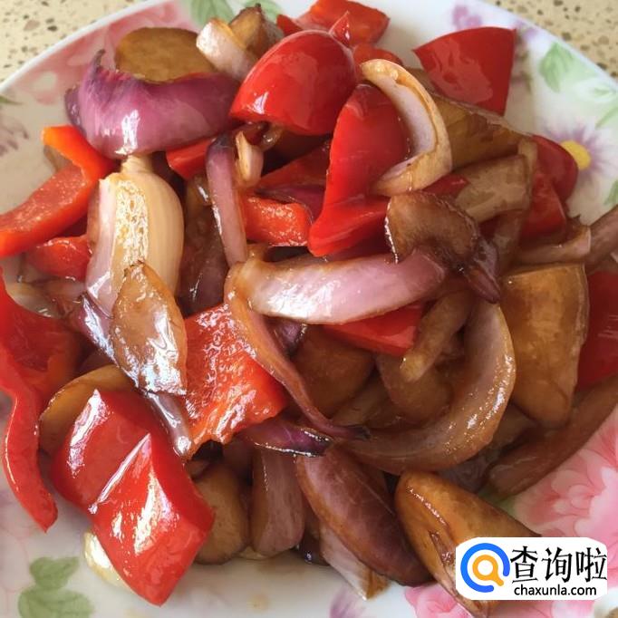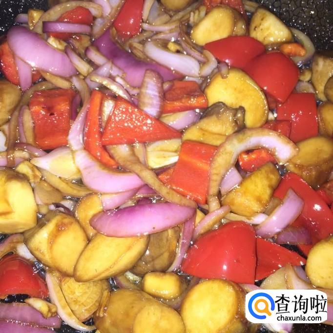 将洋葱下入锅里,翻炒几下,再将红椒也下入锅里,一起翻炒;翻炒均匀,试一下味道,如果味道适宜,将火调大,煮到收汁至料汁浓稠就完成了!