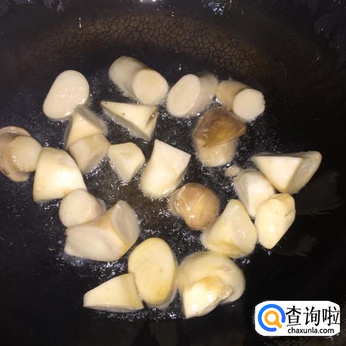 开火,锅里加入适量的食用油,将杏鲍菇下入锅里,翻炒至表面微黄;