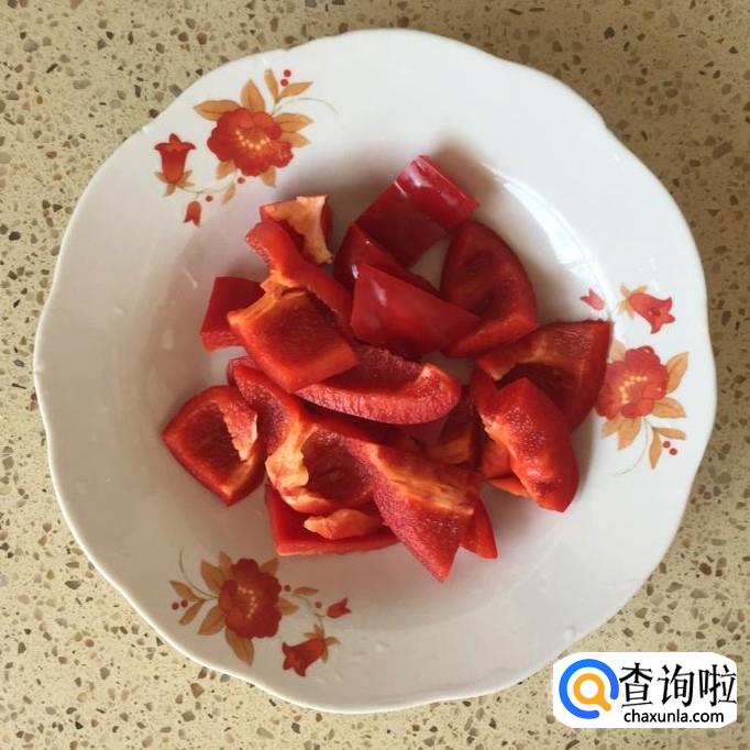 取一个红椒,将红椒去蒂去籽,洗净,然后切成片状;切成别的形状也可以,切成片状,在这道菜里会更好看一点;