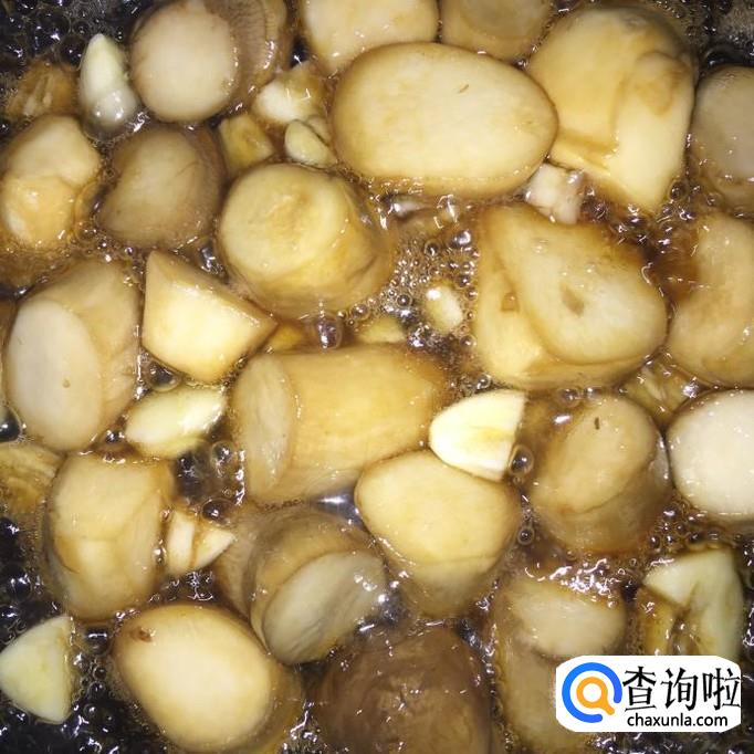将料汁倒入锅里,再加入比料汁稍微多一些的水,翻炒至杏鲍菇九成熟;
