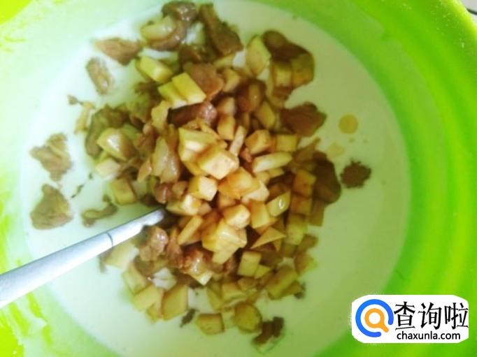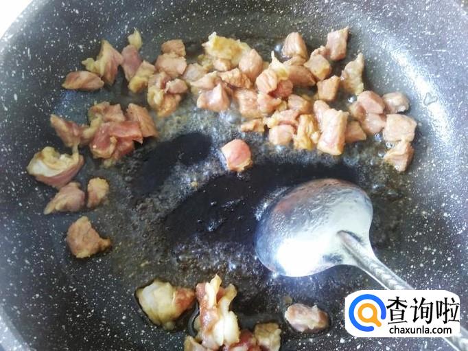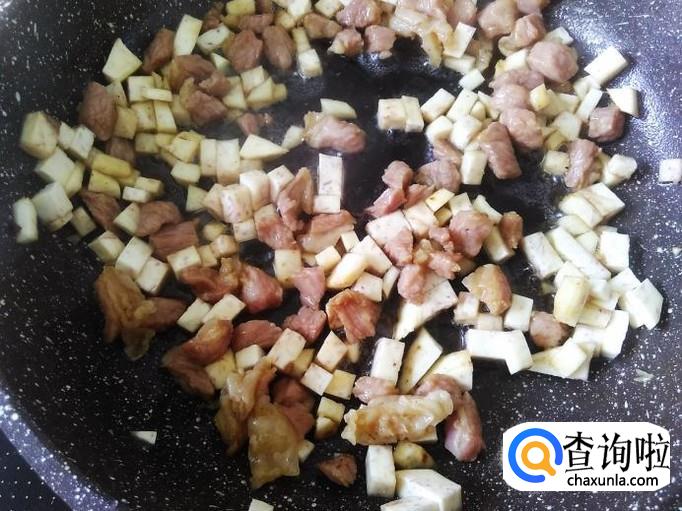然后把炒好的芋头肉丁铲上盘里混合一起搅拌均。