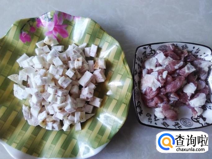 芋头去皮然后切成小丁,猪肉清洗干净切成小丁。
