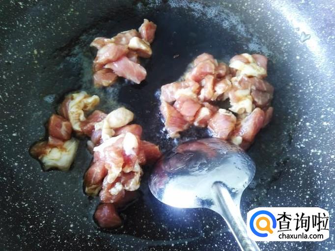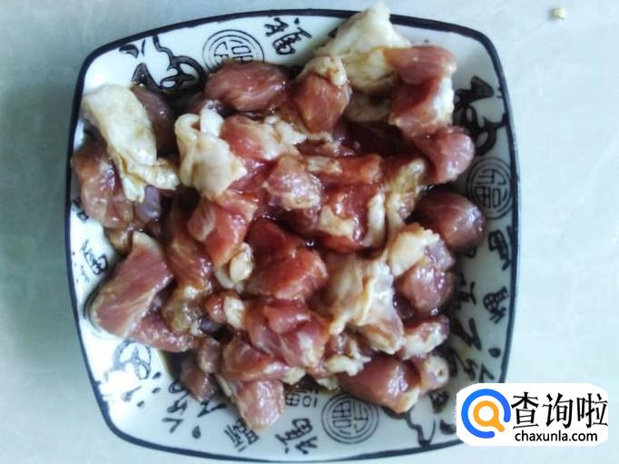 猪肉丁加适量的生抽,料酒腌制几分钟。