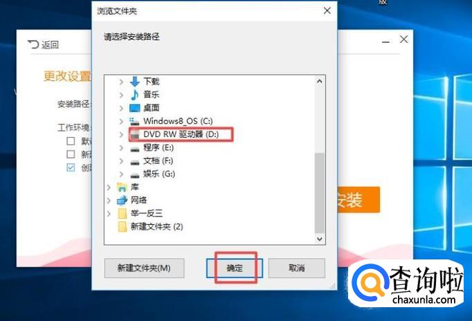 弹出的界面,我们选择D盘,之后我们点击确定,然后我们点击安装进行安装就可以了,还是比较简单的,相信大家现在都会了。