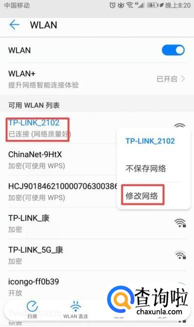 弹出的界面,我们长按连接的网络,然后我们点击修改网络;