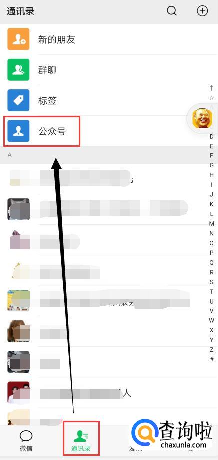 登录微信后,点击下方的通讯录,然后选择上方的公众号。