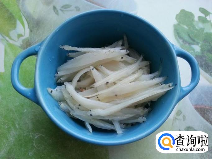 温水浸泡银鱼干,最好将时间控制在15分钟。泡好之后捞出,再用凉水清洗一边。