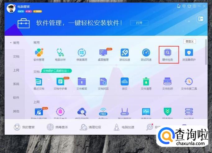 在(常用)功能界面中会看到(硬件检测)功能,如图所示