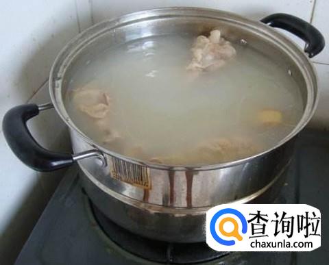 煲汤桶上火,冷水入老母鸡、猪肘子、猪肚、姜、葱,旺火到沸腾,转中火打尽漂沫,旺火熬制2-3小时,汤色变成白色将原料沥出来即可。