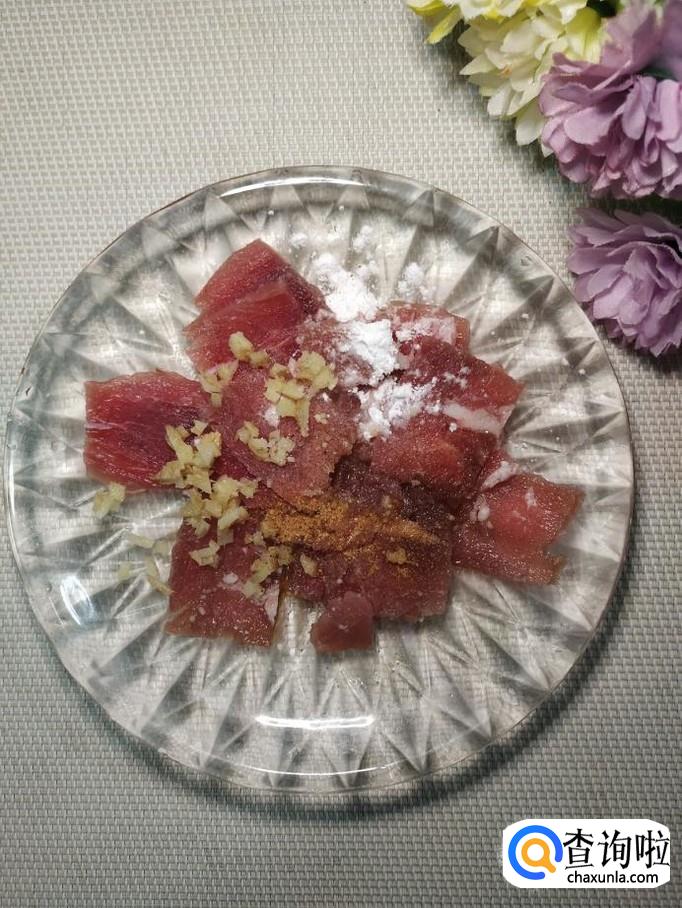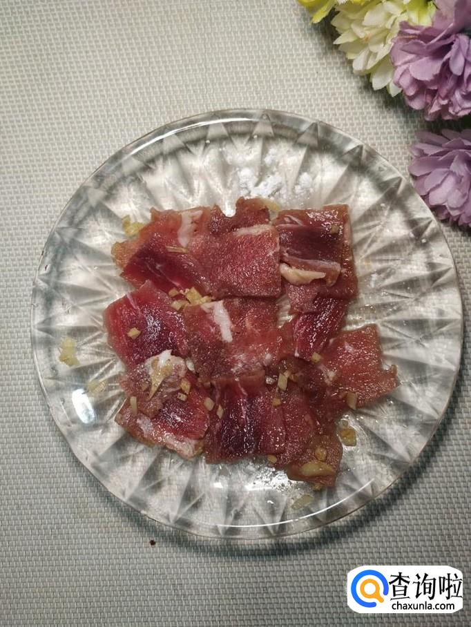 准备适量牛肉,洗净后切成薄片,再准备适量生姜,洗净后,切碎放在上面,加入适量盐,鸡精,五香粉,生抽,料酒,淀粉,搅拌均匀,腌制十分钟左右。