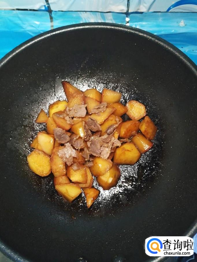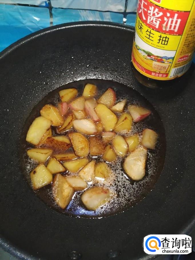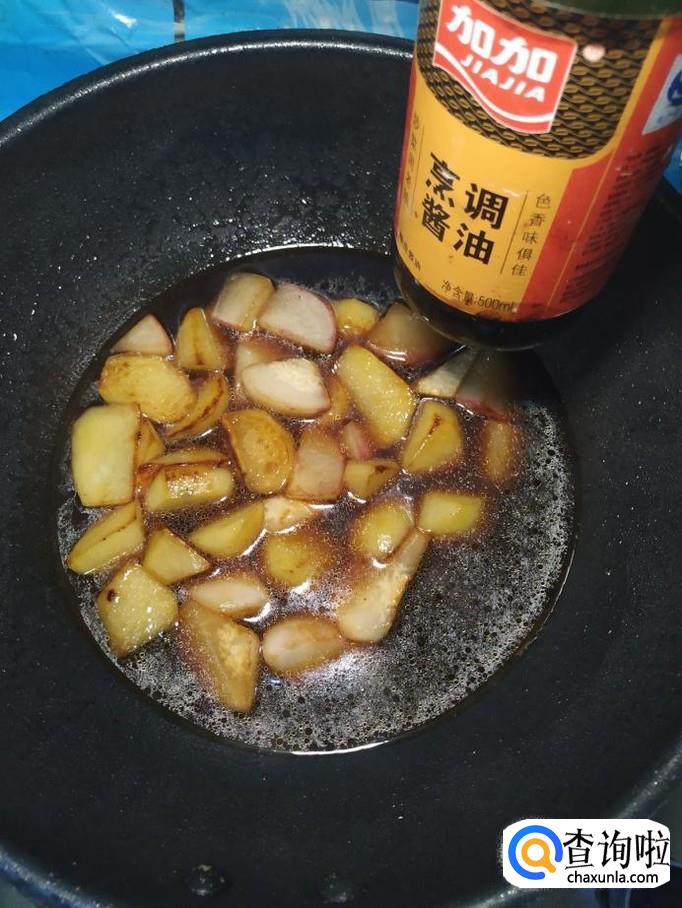 加入小半碗清水,没过土豆和萝卜,加入适量生抽和老抽,大火将水烧开,水开后改小火,收干汤汁。