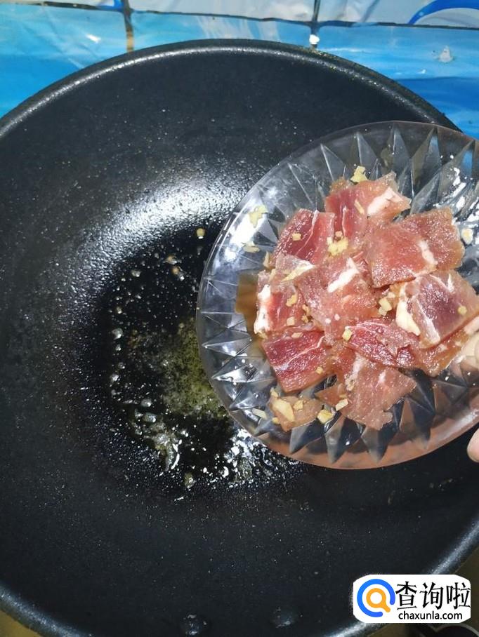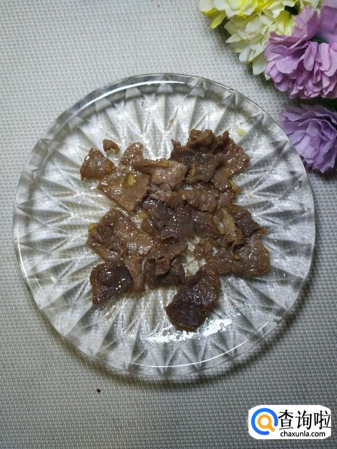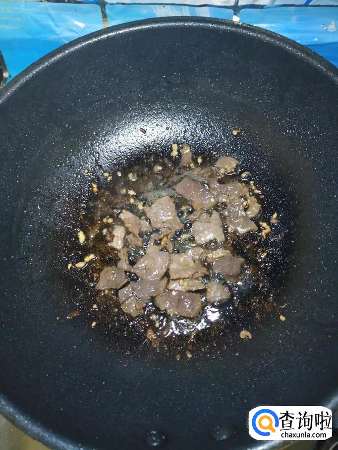 炒锅中放入适量油,油热后,将牛肉放入锅中炒熟,盛出备用,切成薄片的牛肉特别容易熟,不要炒太久,以免炒老。