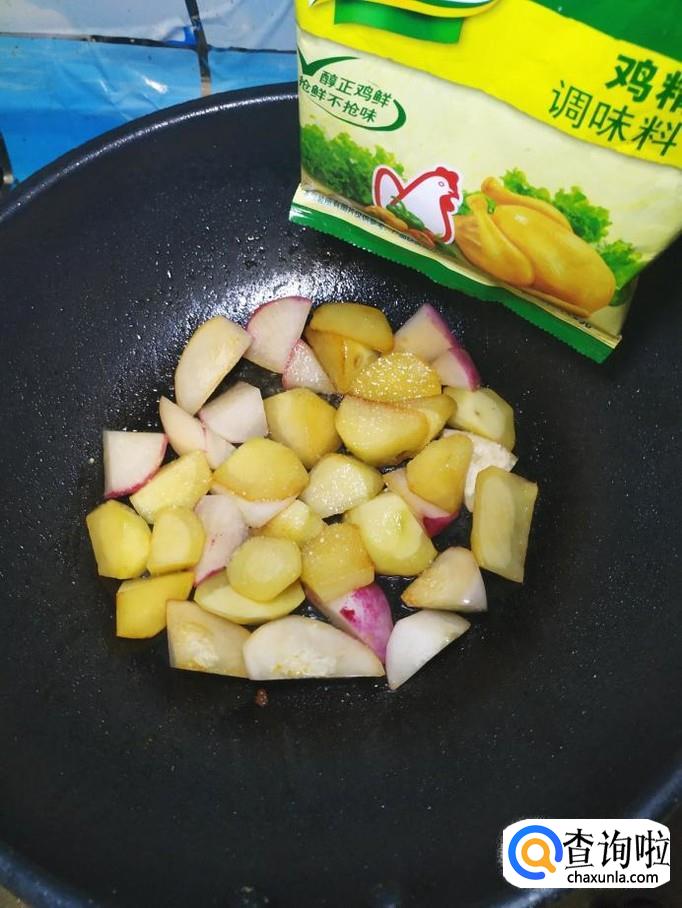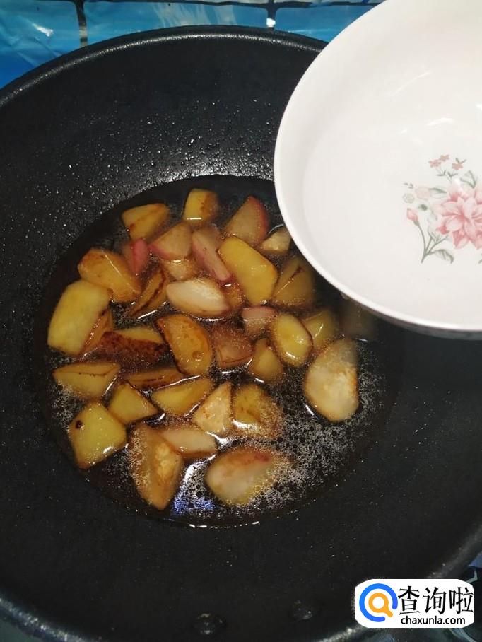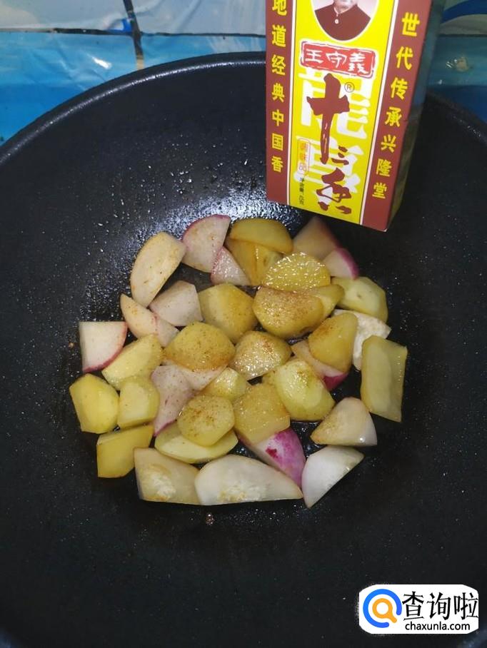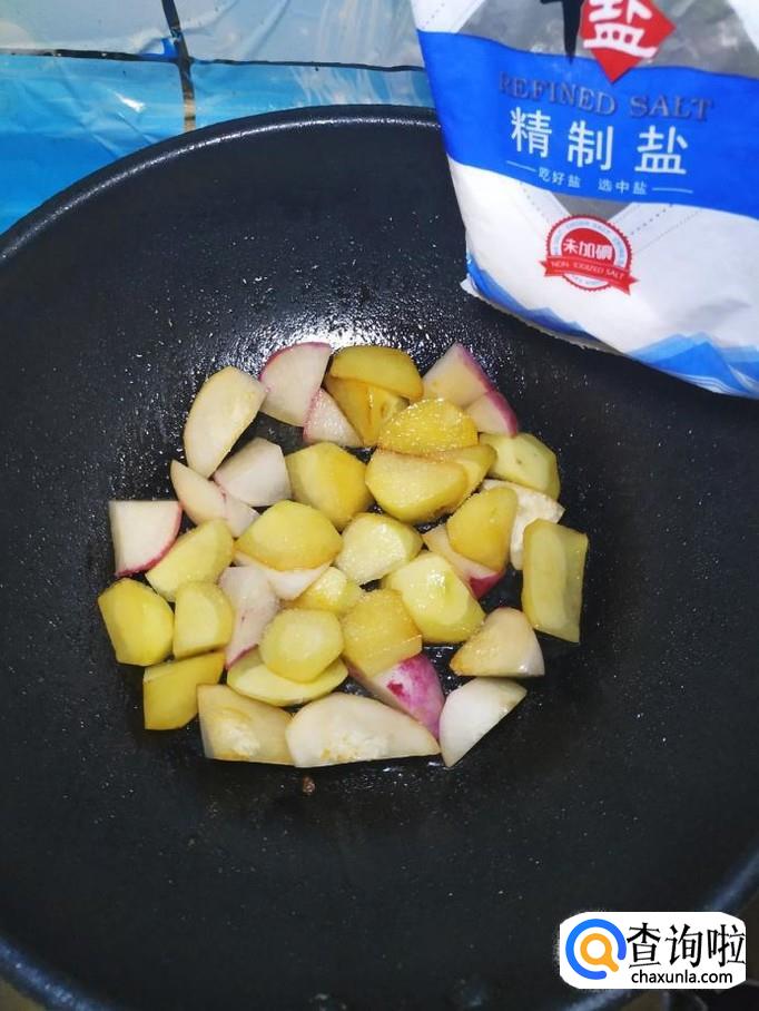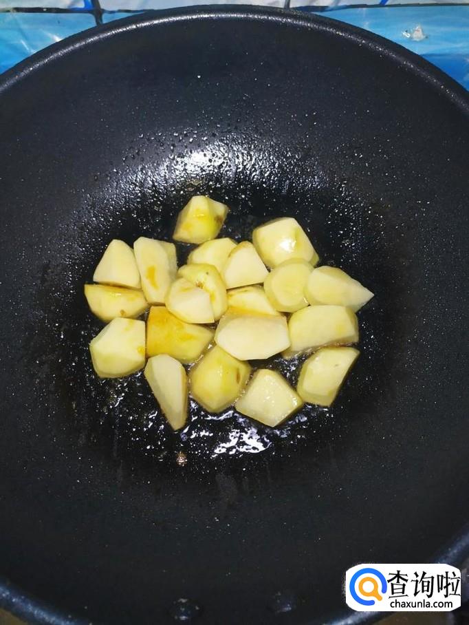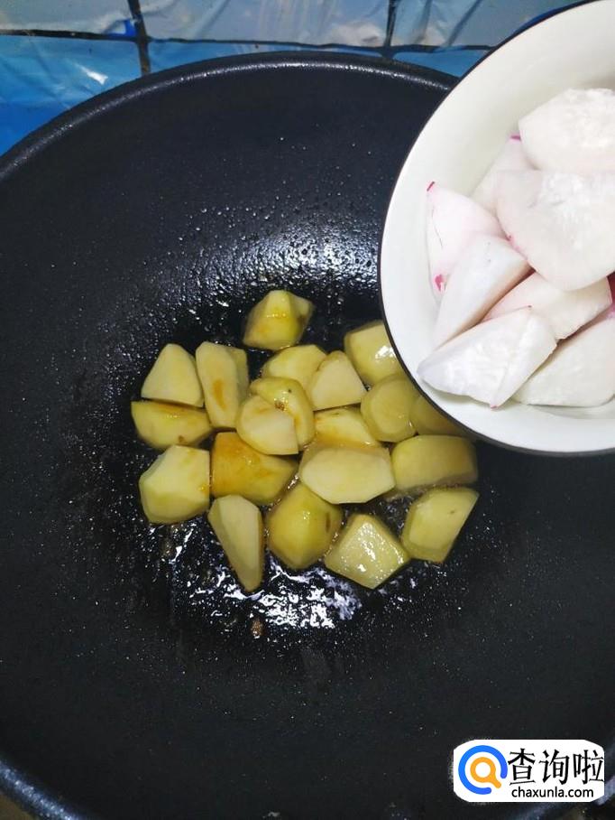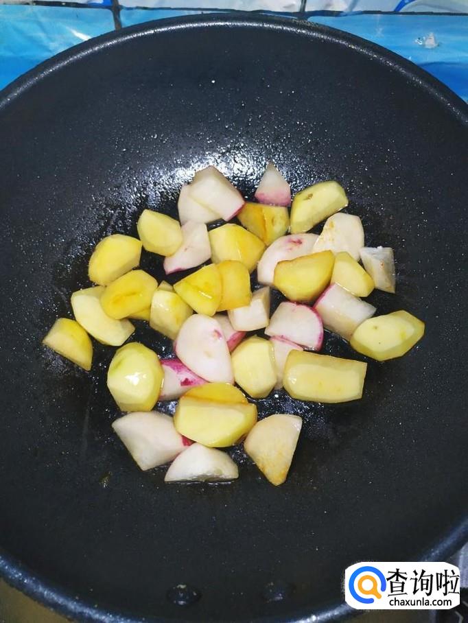 将切好的红皮萝卜块儿也倒入锅中,和土豆一起翻炒均匀,让它们均匀的沾上一层糖色。