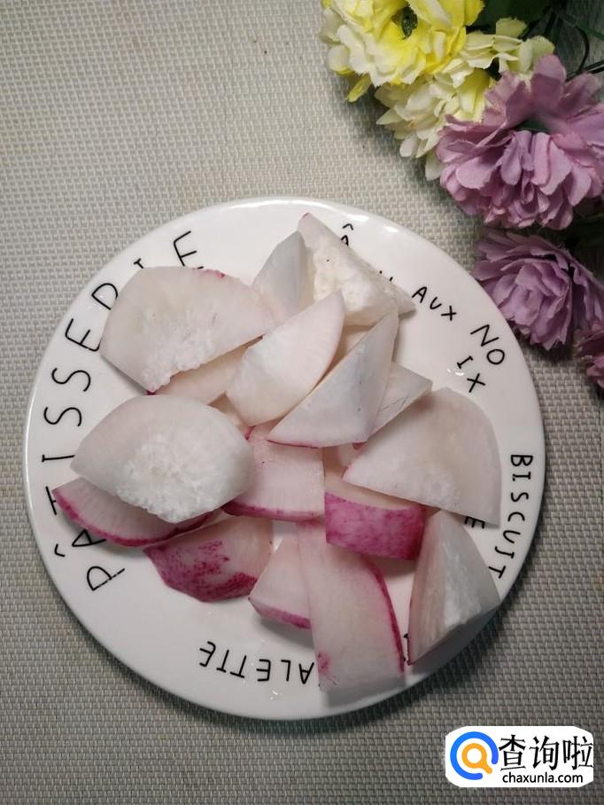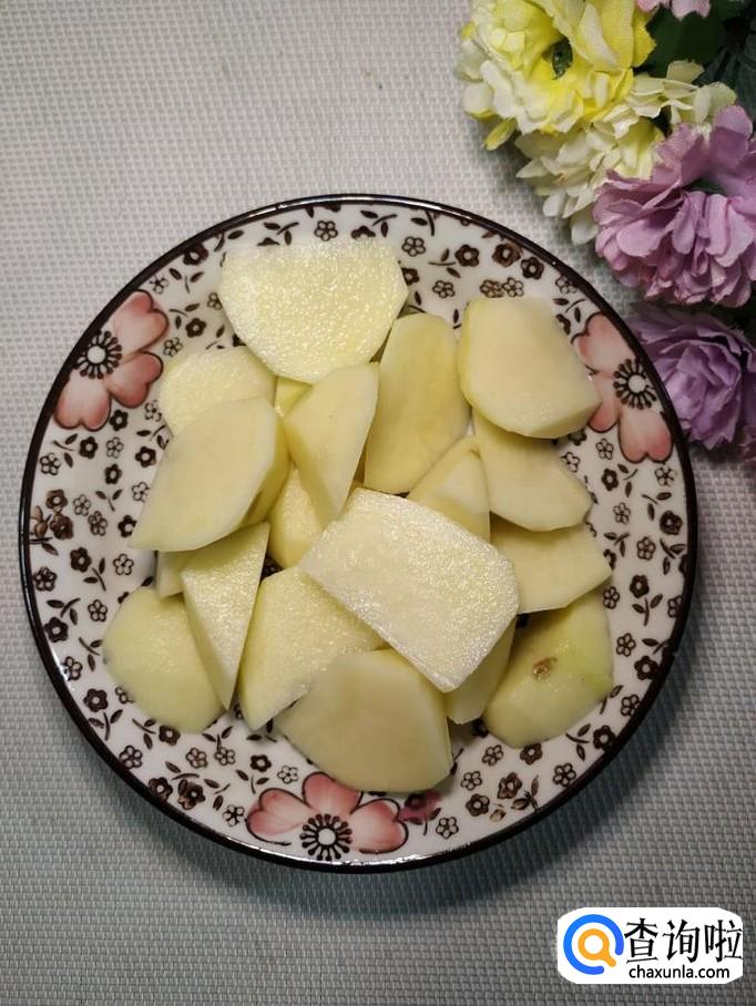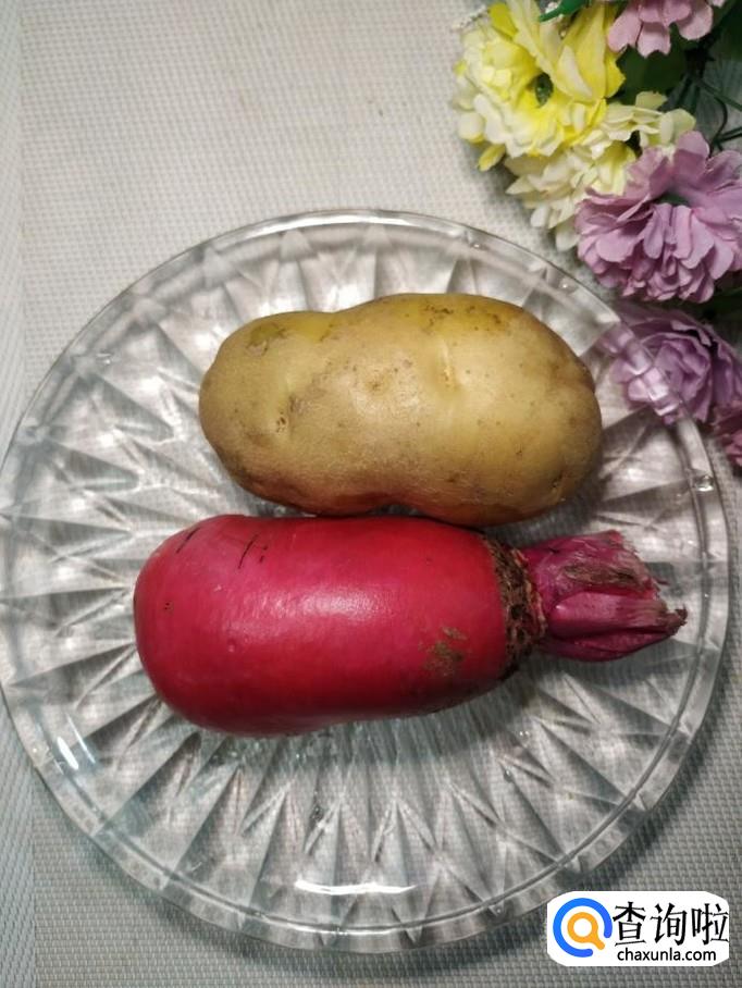 准备适量土豆和红皮萝卜,将土豆洗净后去皮,切成滚刀块儿,洗去淀粉,放入盘中备用;将红皮萝卜洗净后,去除外皮,也切成滚刀块,放入盘中备用。