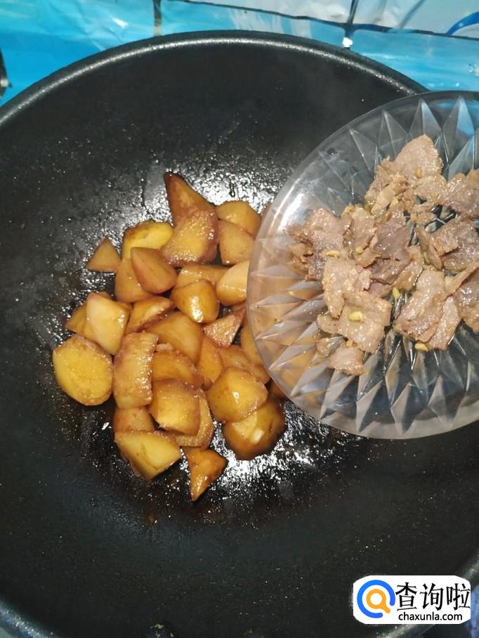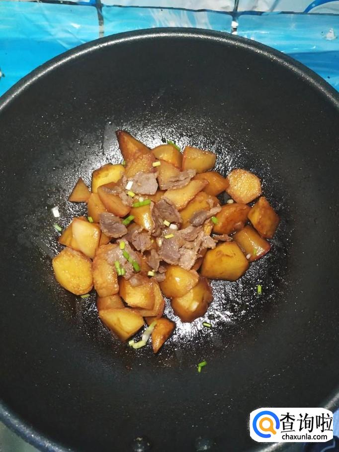 待汤汁快要收干的时候,将之前炒好的牛肉片放入锅中,翻炒均匀。