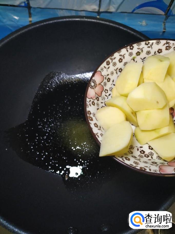 炒锅中留少许油,放入适量白砂糖,炒出糖色后,将土豆块倒入锅中,翻炒均匀。注意火候,看到白砂糖开始变色,立即将土豆块倒入锅中,否则味道会发苦。